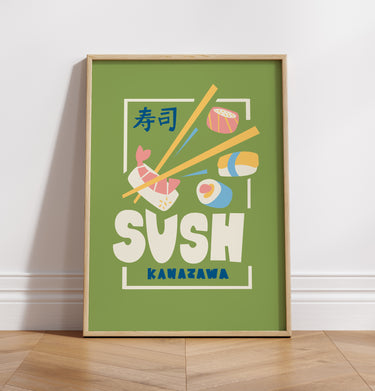 'Sushi' Vintage style Japanese art print. Ideal for adding a pop of colour to your Kitchen, or anywhere in the home. Designed in beautiful bold colours this print is perfect as a gift to someone special, including yourself! Available in 4 different colours to match any interior.